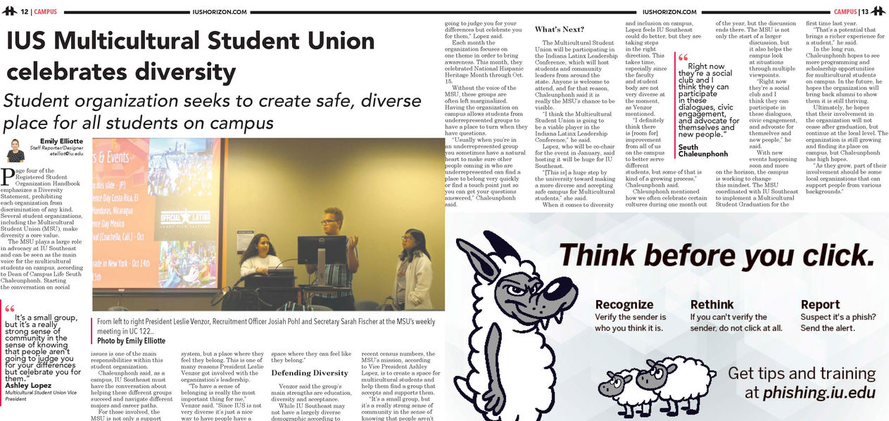 I began my work at The Horizon as a staff designer. The semester after, I was asked to become the Design Editor and hired a team of designers to work with me. Below are some of the spreads, ads, info graphics and covers I have completed while on staff at The Horizon.